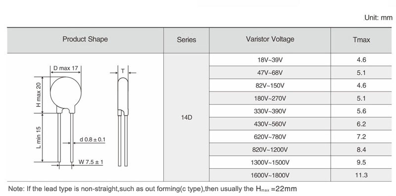 | Part No. | Varistor Voltage | Maximum Allowable Voltage | Maximum Clamping Voltage | Withstanding Surge Current | Rated Wattage | Energy | Typical Capacitance | Datasheet Download | ||